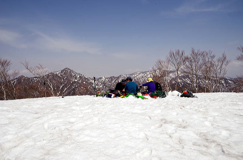 ![]() 湯蔵山から戻って元光兎の山頂で憩いのひととき 女川の谷を挟んで正面に光兎山と頭巾山 |