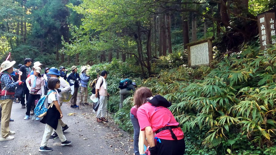 | ここは出羽街道、羽越国境の堀切峠 想定外の好転に恵まれて 善男善女、歩く、歩く 中継宿から小俣峠を越え、小俣宿で一休み そこから、ここ堀切峠まで来た ここを越えれば、羽州小名部宿 今、老若男女がまさに跳び越えているラインが 越後国と出羽国をふり分ける国境のライン 目に見えないそのラインを、一、二の、三で一斉に跳び越えたつもり 秋の一日、にぎやかにおしゃべりウォーキング 山中であれば、何の迷惑も無し 熊でさえ、じっと息をひそめて、うらやまし気に息を殺す ひと気の絶えた古街道、この時ばかりは往時の賑わい |