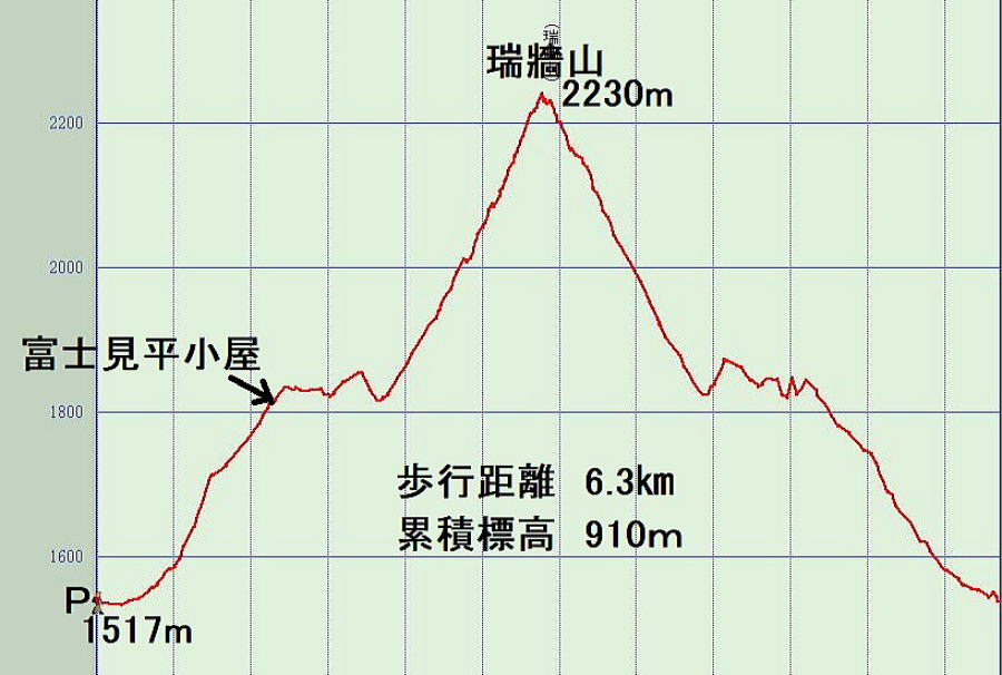 | <コースとタイム> P発7:37ー8:49富士見平小屋8:57-11:55山頂12:53-14:59富士見平小屋―15:42P着 |