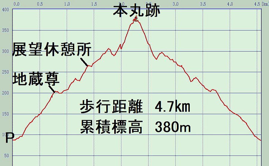 | <コースとタイム> P発9:04-10:05展望休憩所10:14-11:04本丸跡12:10ー12:50地蔵尊13:00ー13:39P着 |
