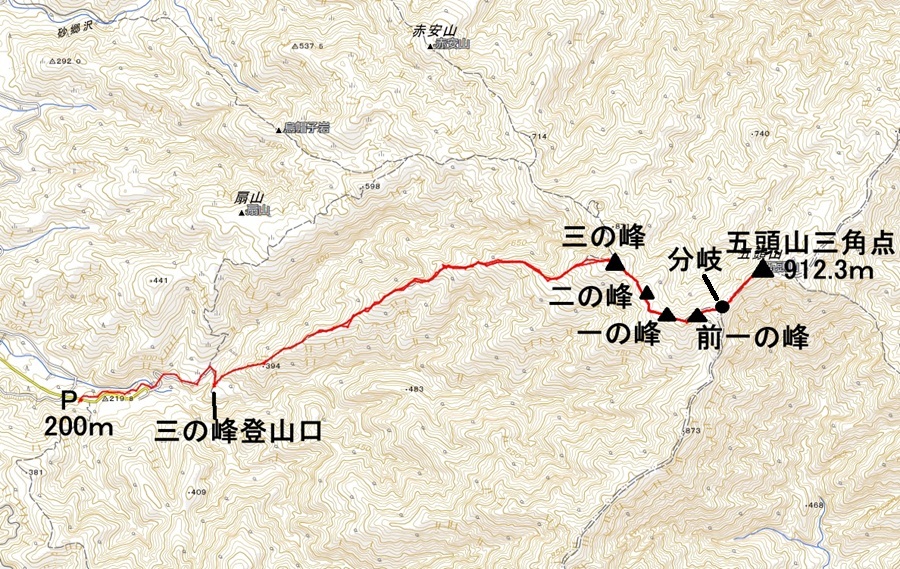 | <コースとタイム> P発7:15―7:35三ノ峰登山口7:52―10:09三ノ峰―10:46縦走分岐(昼食)11:34―12:00三角点12:11―12:32前一ノ峰―12:57三ノ峰―14:30三ノ峰登山口―14:50P着 |