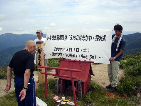 この年、国体が新潟県で開催されることになっていて、そこで使う炬火を県内各市町村で採火することになったという。 採火の仕方は、各市町村独自の方法でということらしく、当関川村では、光兎山山頂で採火することにしたということで、この日、その採火式を執り行うという。 オリンピックの聖火採火式というのはTVで見たことはあるが、国体の炬火採火など、どんなふうにするのか、しかも光兎山の上で、と、珍しいこと好きで、最近山好きになったばかりの当方としては興味津々、採火団の一員に加えてもらって光兎山に登った。 スタッフの一人が大きなパラボラアンテナを担いでいた。大きすぎて登山道の木の枝に憚るところも多く、横になったり斜めになったりしながら、難儀して山頂まで担ぎ上げたそのスタッフ、元からの山男で、さすがと敬服するしかなかった。 さて、その山頂で、にぎにぎしく採火式が執り行われた。 ギリシャの聖火採火式は麗しき乙女たちが厳かに執り行っているようなのだが、ここ関川村では、むくつけきおのこどもが恭しく執り行った。 無事採火された種火は、県から配布されたという専用の容器に継火され、大事に麓まで下ろされて、この日の採火式は終ったのだった。 可笑しかったのは、専用容器に継がれた種火が万が一途中で消えたときの用意として、なんと、採火した火の一部を蚊取り線香に継いで、それを燻しながら下山したこと。 可笑しいなどというのは失礼なことであって、真面目に万一の場合の策を講じたのだろうが、蚊取り線香という発想が実に愉快で可笑しかった。 火を継ぐということで思い出したのだが、1月15日の歳の神で「ホヤホヤ」と称して茅を組んで火を燃す行事が今も続いているが、子どもの頃、祖父がその火でタバコを吸うと一年息災でいられるということで、歳の神の火で木の枝の先を燃し、その火を家まで消さずに運んでくるように命じられた。 枝の先の赤い火にフーフーと息を吹きかけて起こしながら、消えないうちにと家まで走って祖父に届けたものだった。 「おったいぎ、おったいぎ(大儀)」という祖父の決まり台詞とともに、妙なことを思い出してしまった。 ともあれ、2度とこのような登山は経験できないだろう。そういう意味で、山歩紀行の貴重な一頁になった。 |