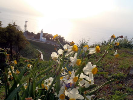 旅の途中の越前岬 せっかく出かけるのだからと、Okkaaと二人、のーびりと北陸路をドライブで行くことにした。 越前岬には、まだ、越前スイセンが名残を惜しむように数株残って咲いていたが、夕暮れの季節はずれの越前岬、人っ子ひとりいなかった。 灯台、岬、スイセン・・・何やら歌謡曲の題材になりそう。越前岬を唄った歌謡曲があったかどうか・・・。思い出せないまま、それらしい歌を、ハンドルを握りながらうなってみた。(4月2日) |