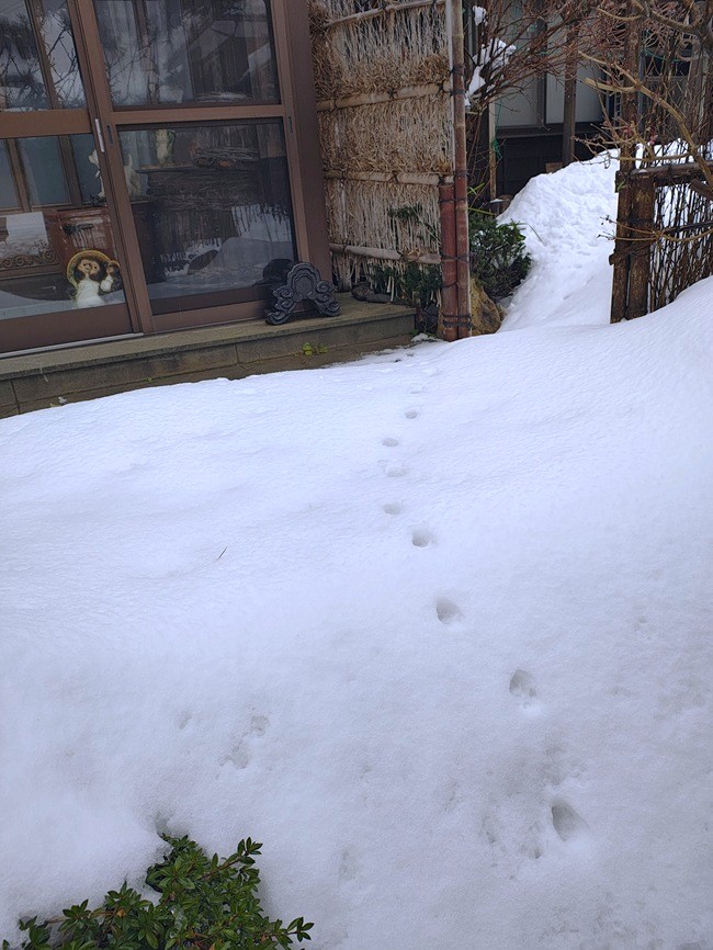 10年に一度の大雪と すさまじい前ぶれに多少慌てた 予定していた山の会の五頭山登り初めも月末に延期したのだが 幸いというべきか どうやらことなく治まったふう 朝風呂へと玄関を開けてみれば 雪の上に点々と足跡 一列に続くのは 紛れもなく狐 たまによく遊びに来る狐が また来たらしい いつぞやは 夜 二階の物干しから 何気なく下を見たら 玄関の前にシルエット 耳が二つ立ってキョロキョロ もう随分前になるが 土手をランニングしていたころ 河川敷から出てきた狐に 遇った しっぽの長い きれいな狐だった 多分あの狐か あるいはまたその子狐か はたまた孫狐かが たまに時々来ているらしい クリやキノコを置いて行ったことは 一度もない 助けたことが一度もないのだから お礼がないのも 当然と言えば当然なのだが 遊び場にしているのなら クリの一粒くらい 置いて行っても よさそうなもの ともあれ 新年も早や半月過ぎる このまま 少雪で冬が終わってくれれば 息子が数年前に送ってくれた 楽々雪下ろし棒も 一昨年 鉄工所に特注で作ってもらった 屋根用安全アンカーも 出番なしで めでたしめでたし なのだが 下旬ごろ また10年に一度なんて言ってるし さてはて ⇑ページのTOPへ |