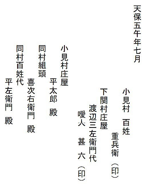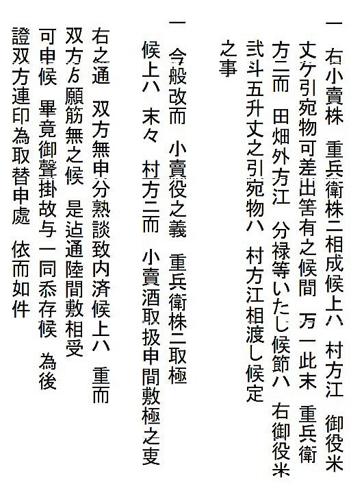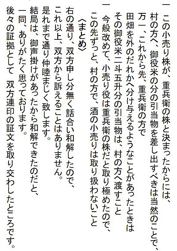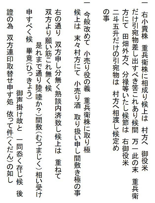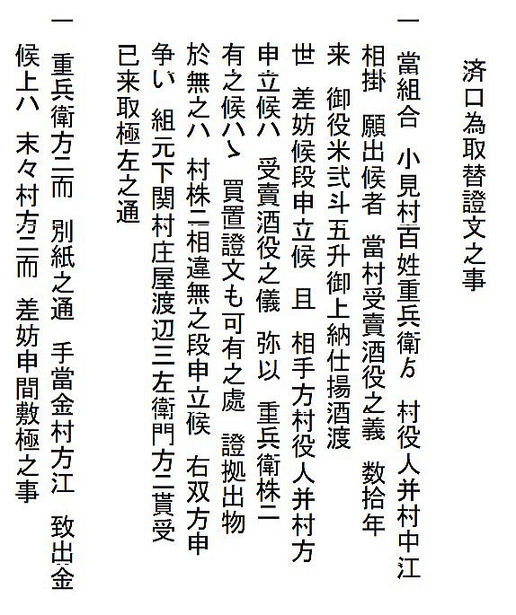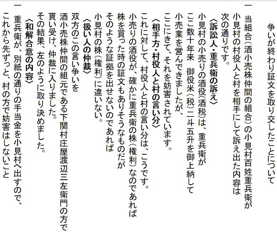 | <解説> 1 この文書は、済口證文か?いや、違う! この文書、表題が「済口為取替證文の事」となっていて、一見、済口證文のように見える。 また、文書前段に書かれた四項目は、訴えの内容と反論、そして仲裁と合意の内容が書いてあり、これも済口證文の内容そのものである。 さらに、本文最後の一行に、「後証の為、双方連印取替せ申す処、依って件の如し」と書いてある。これも、まさに済口證文のことである。 だから、ついつい、この文書は争いが納まっての済口證文かと思ってしまう。 しかし、末尾の差出人と宛先を見れば、双方連印して取り交わした文書にはなっていない。済口證文であれば、訴訟人(原告)と相手方(被告)と噯人(取扱い人=仲裁人)が連印する。 ところが、この文書は、訴訟人の重兵衛と仲裁人の渡辺三左衛門の代理が印を押し、宛先は、相手方である小見村三役になっている。 これは一体どういうことだろう。 2 済口證文でなければ、一体、何の文書だ? 文書の末尾をよくよく読んでみれば、この文書は、済口證文を取り交した後で、それとは別に、重兵衛と仲裁人から村三役に出された文書であることが分かる。 なぜ、そんなことをする必要があったのか。 そのなぞを解くカギは、最後から二行目の「畢竟、お声がけ故と一同かたじけなく存じ候」の文言にあることに気づく。 つまり、「このように和解合意の結果に至ったのは、三役からのお声がけがあったからで、ありがたく思っております」と、この御礼を言うために、前段に和解合意の内容、つまり済口證文の内容を書いたのである。 では、なぜ、訴訟の相手に対して、このような礼状を書く必要があったのか。 3 争いの発端 重兵衛は、「数十年、受け売り酒役の役米2斗5升を納めて、揚げ酒渡世をしてきた」と書いてある。受け売り酒とは酒の小売りのことである。役米とは、それにかかる税のこと。揚げ酒渡世とは、酒の小売業、つまり、小売り酒屋のことである。 安政4(1775)年の小見村への年貢割付状(納税通知書)にも「諸売酒屋役 米2斗5升」とある。数十年というから、59年前のこの納税も重兵衛家が行っていたのではないだろうか。 安政4年の小見村年貢割付状は ⇒こちら 江戸時代の様々な商売の権利は「株」という言い方をしていた。株は売買ができた。株売買の時の領収書が株の証文になった。 重兵衛の株は数十年来のもの、売買証文も、おそらくその間必要もなく紛失状態だったのだろう。 どういうわけか、ここへきて、その証文の有無が問題になった。 重兵衛はそれを提示できない。ならば、重兵衛の株ではなく、小見村の株だ。と、「村役人並びに村方が主張した」と書いてある。 「村方」とあるが、それを強く主張した村民がいたということで、村の三役も他の村民も、その強硬論にあえて反対するだけの明確な理由もないまま、表向き同調した形になったということだろう。 4 落とし前をどうつけるか とは言え、数十年、重兵衛家が行ってきた稼業を今さら取り上げるというのも穏当ではない。 そこで、渡辺三左衛門の登場となる。 三左衛門は、酒小売組合の元締めである。長年、組合のメンバーであった重兵衛の難儀を座視できない立場にある。 株の持主たちは、株仲間という同業者組合を作る。文書冒頭の「当組合」とは、まさにそのことを言っている。 だから、三左衛門は第三者ではなく、仲裁人としては中立的な立場ではない。 おそらく、村三役はそれを承知で仲裁に入ってもらったのだろう。三左衛門は下関村の庄屋であり、小見村庄屋平太郎とは親しかったはず。もちろん、訴訟先である代官所も承知の上のはず。 証拠書類を提示できないのは重兵衛の落ち度。それを好機と見て権利を取り上げてしまおうとする一部の勢力。しかし、何十年も続けてきた稼業を取り上げるのは、誰が見ても、強引で不自然。強硬派の振り上げた拳を降ろさせるために、結局、金で落とし前をつけて問題解決。「どうだね、このあたりで、手を打たねかね」と、これが、お声がけの意味なのではないだろうか。 5 この文書に付随したはずの文書 ということで、この文書のほかに、取り交わした済口證文一通と拠出金額を書いた重兵衛の提出文書一通があることになる。残念ながら、その二通は見当たらない。 |