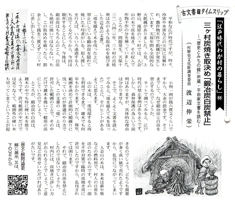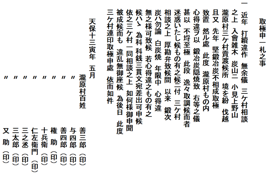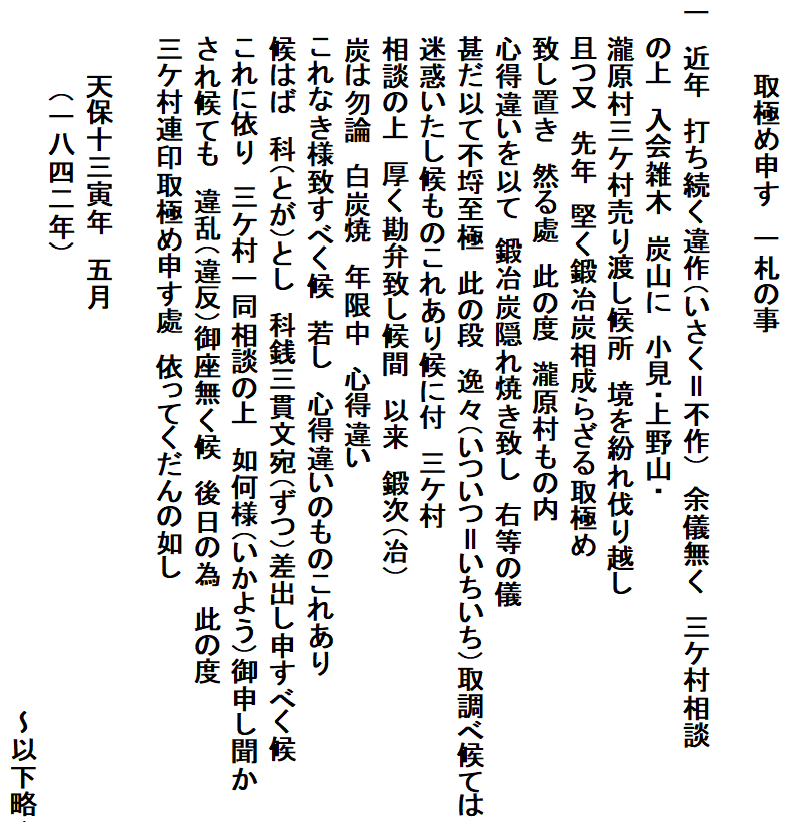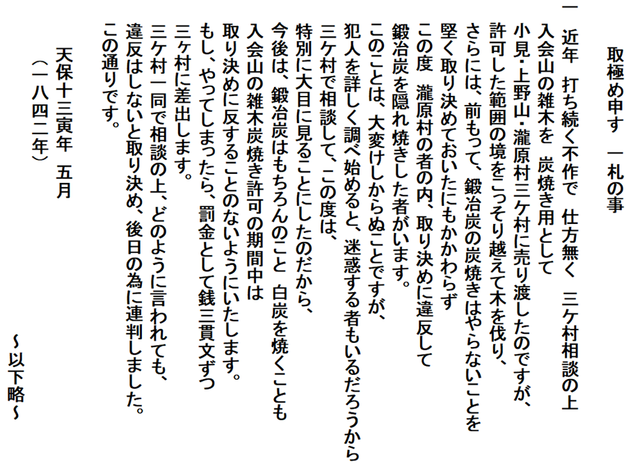 | <文書の解説> 1 時代背景 天保といえば、大飢饉。天保4~8年の冷害で全国的な凶作、それを契機に天保12年から行われた「天保の改革」。歴史教科書でよく扱われる事件。この文書の冒頭に「近年、打ち続く違作(不作)」とあるのは、そういった時代背景がある。 入会山の木は、本来、村内各家の燃料源。それをやむなく炭にして換金せざるを得ない状況だった。 2 文書の作成意図 ところが、問題が起きた。「境を紛れ」とあるのは、単に間違ったではなく、こっそり紛れ込んだの意。何のためかというと、禁止の鍛冶炭用原木を伐るため。「且つ又」は、その上でとか、さらにまたの意。だから、こっそり紛れ込んで木を伐り、その木で鍛冶炭を焼いた。 鍛冶炭を焼くのは、前々から、禁止の取り決めだった。それを破った者が出たから、改めて、今後のための取決めを結んだ。併せて、鍛冶炭だけでなく白炭の取決めについても再確認した。 鍛冶炭と白炭の禁止理由は書いてないので、その考察を広報紙に掲載した。 3 「科銭三貫文宛差出可申候」について 普通に読めば、一人三貫文ずつ差し出すという意味になる。しかし、何人も違反者が出るとは考えにくい。今回の違反も、滝原村者内とあり、多分単数だろう。だから、今回は見逃すことにしたのであって、もし多人数だったら、ほかの二村が許さないだろう。 よって、この「宛」は、一人三貫文ずつではなく、三ヶ村に各村三貫文ずつと、読んだ。九貫文なら約1両半、大金になる。これくらいでなければ、防止策にならない。 4 記名押印者について この文書の人物名と、8年前の三村村定に登場する人物名を比べると、各村1~2名の増減があるが、ほぼ各村の本百姓全員で、炭焼きを行う人だけというわけではないだろう。つまり、入会雑木の払い下げを受けたのは個人ではなく、各村ということになる。 <参考> ※以下、黒文字が両文書に登場、緑文字は、片方のみ。 (1) 天保13(1842)年のこの文書に登場する人名 龍原村14名・・・善三郎 与四郎 善四郎 権助 十兵衛 仁左衛門 三之丞 三太郎 又助 久右衛門 市右衛門 太郎七 勘兵衛 庄屋・善太夫 上野山村9名・・・庄三郎 又兵衛 佐平 間兵衛 安兵衛 助右衛門 佐二右衛門 権右衛門 庄屋・九兵衛 小見村17名・・・孫二郎 徳十郎 与兵衛 長右衛門 孫兵衛 長藏 永助 嘉右衛門 甚助 五郎助 佐五兵衛 六助 平左衛門 重兵衛 利忠太 喜次右衛門 庄屋・平太郎 (2) 天保5(1834)年の三村村定に登場する人名 瀧原村16名・・・仁左衛門 与四郎 五郎兵衛 権助 善四郎 善三郎 市右衛門 三之丞 久右衛門 重兵衛 又助 三太郎 勘之丞 太郎七 八右衛門 庄屋・善太夫 上野山村10名・・・又兵衛 九右衛門 間兵衛 庄三郎 安兵衛 助右衛門 佐兵衛 佐次右衛門 権右衛門 庄屋・九兵衛 小見村15名・・・久米次 嘉右衛門 孫次郎 五郎助 長蔵 六助 佐五兵衛 重兵衛 長右衛門 永助 孫兵衛 利忠太 平左衛門 喜次右衛門 庄屋・平太郎 ※ 通常、代々の名を襲名するが、すぐに襲名できない場合やそれまでの名で通す場合もあったようだ。また、何かの都合で連判状に参加できない人もいたのかもしれない。 |