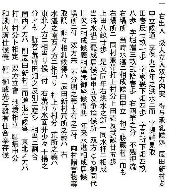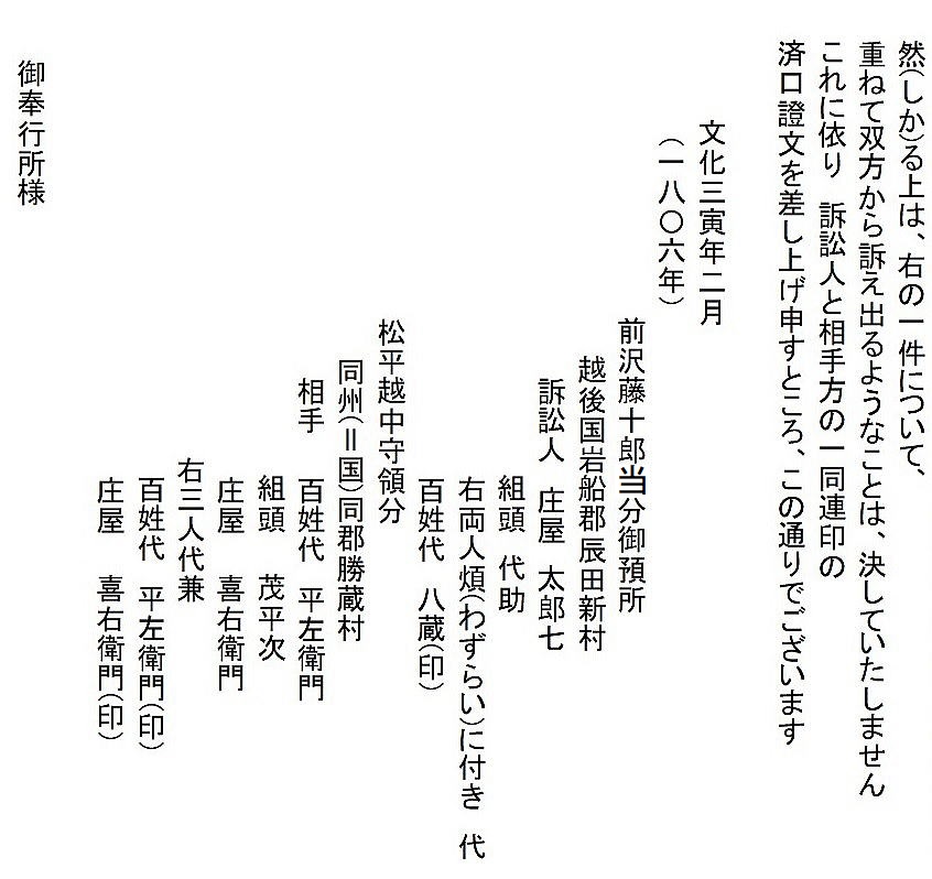 | <解説> 土地の所属について、辰田新村分か打上村分か、争いとなり領主の役所へ訴え出となりました。 1 出訴から和解示談までの経緯 訴えたのは辰田新村の村役人(庄屋・組頭・百姓代)ですが、訴えられたのは勝蔵村の村役人になっています。その理由は、打上村の村役人は勝蔵村の村役人が兼任することになっていたからです。 訴えた先は、「御奉行所様」となっています。 当時、辰田新村は幕府領(前沢藤十郎預地)で水原代官所の管内ですが、打上村も勝蔵村も白河藩(松平越中守)の領地でした。ですから、白河藩の奉行所へ訴え出たことになります。この場合、訴状には水原代官所の添書きが必要でした。つまり、水原代官所の了解の下での訴訟です。 訴状が受理されると、御差日が指定され、その日に訴状に対する答弁書をもって出頭するよう、奉行所から訴訟の相手方への命令書が発行されます。担当役人の印があるので、これを御尊判といい、この命令書を訴訟人が受け取り、持ち帰って相手方へ示し、裁判に引き出すことになります。 事はそこまで進行したのですが、まだ裁判は始まってはいません。その段階で、扱人が選出され仲裁に入ったのです。 江戸時代の裁判の多くは、法廷審理に入る前に、現地熟談内済ということで、現地で仲裁人を立て、和解示談に持ち込むのが常套手段でした。 その結果出来上がったのが、和解示談の証であるこの「済口證文」です。 多くの場合、済口證文には、仲裁した扱人の名が記されるのですが、この文書にはありません。遠く離れた白河藩にとっては、それはどうでもよいことだったのかもしれません。 ただ、この文書が小見村の平田家に残ったということは、平太郎が扱人だったからでしょう。小見村庄屋平太郎は多くの争いで扱人の役を務めています。 なお、扱人は複数が普通です。この場合は、幕府領と白川藩領の双方から出すことになります。平太郎は幕府領からです。岩船郡内の白河藩領は桃川組に属していたので、もう一人の扱人は桃川村庄屋がなったと思われます。 2 和解示談の内容 (1) 争点 この文書の時から82年前の享保9年(1724年)に洪水があり、川水が押し寄せて耕作不能になった土地がある。そこは、今(文書の時)は水溜りになっている。 そこには、辰田新村分の田畑4筆分計2反4畝40歩と、打上村分の田計2反45歩があった。 80年もたって、水堪りの一部が干上がってきたのだろう、荒れ地になっているという。そこを両村で分け合おうとしたのだろうが、元の田畑の位置や境界が不分明で争論となり、出訴に至った。 (2) 和解内容 ①扱人が両村から書き物を取り集め、改めて調べたら、 水溜りの南西の方に辰田新村の荒れ地、 東北の方に打上村の荒れ地があることが分かった ②それで、荒れ地と水溜りの水面と若干の干上がり地を、 両村の元々の田畑面積に応じて案分し、その比率で 南西の方は辰田新村の所属、 東北の方は打上村の所属と決め、 地境に印を立てる ということで、決着。 3 御上の御威光により 済口證文の最後には決まり文句として「偏に御威光と有難き仕合せ」と書かれる。これは単なる飾り言葉ではない。 戦国時代の始まりは地方小領主の領地争いで、裁いてくれる御上がいないから実力行使。 勝つためにはより強い親分を頼り、その子分になる。相手も同様。小競り合いが絶えない。 親分の戦線は拡大、子分は従軍し、自分の領地を保障してもらう。親分が没落すれば、則、自分の領地は侵略される。逆なら領地増。だから、戦の連続。 (以上の経緯については、中公新書「応仁の乱」呉座勇一著に詳しい) 江戸幕府の権威によって、この負の連鎖に終止符が打たれた。 御上に訴え出れば、扱人を選定して、双方の利害を勘案し折衷案を出してくれる。 実力行使は不必要。 こうして平和は保たれた。有難き仕合せというもの。 長い戦国の世を経ての知恵。江戸時代の平和維持策は、もっと見直されてもいいように思います。 |