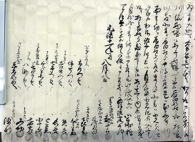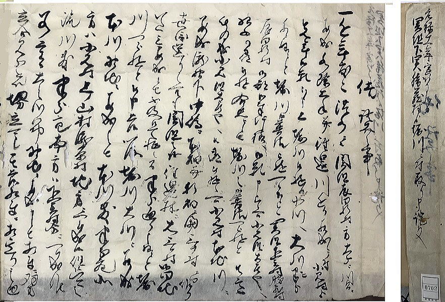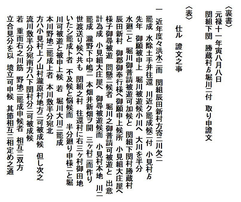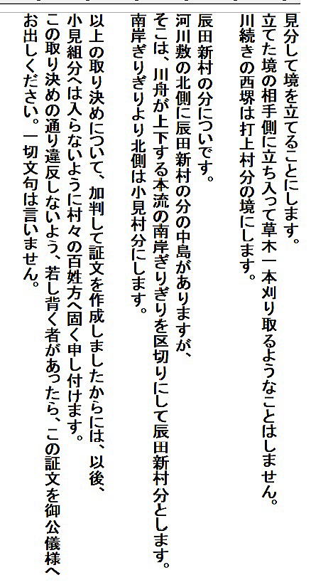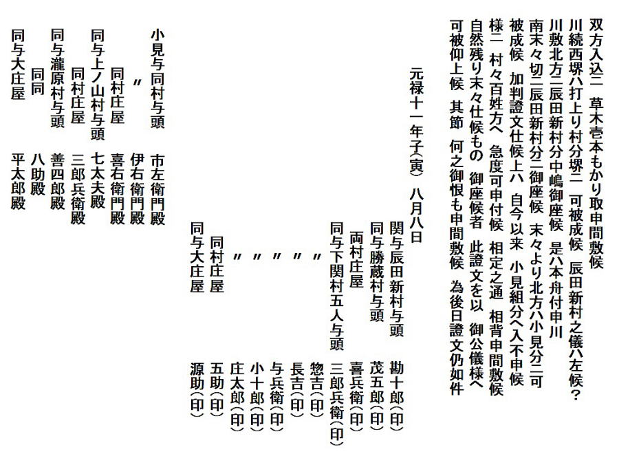 | 平田甲太郎家文書<辰田新村と小見村の境界の定め> 元禄11(1698)年 文書№702 |
