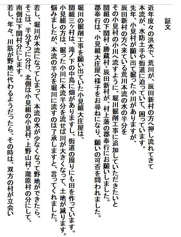 | <解説> 享保元(1716)年に、辰田新村と小見村との間で境界の争論があって、当時の領主館林藩の海老江代官所に持ち込まれた。その際に、18年前のこの文書が、小見村から提出されて、辰田新村の主張は誤りであると判明した。(詳細は文書№631⇒こちら) この文書は、読みにくく、相当こじつけがましく解読してあるが、おおよその内容は、「意訳」のように読み取れる。その概要は、文書№631の解説の欄に書いた。 |