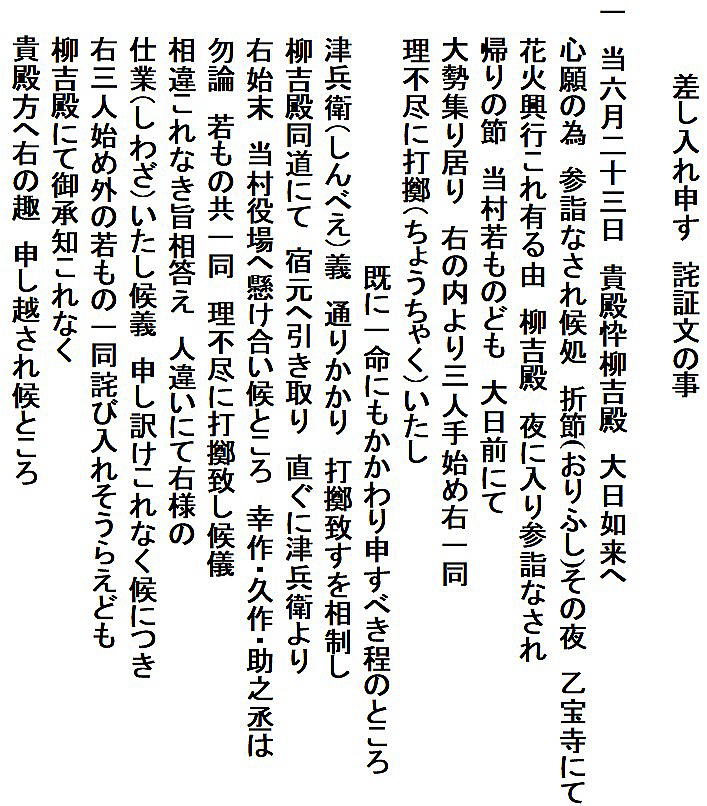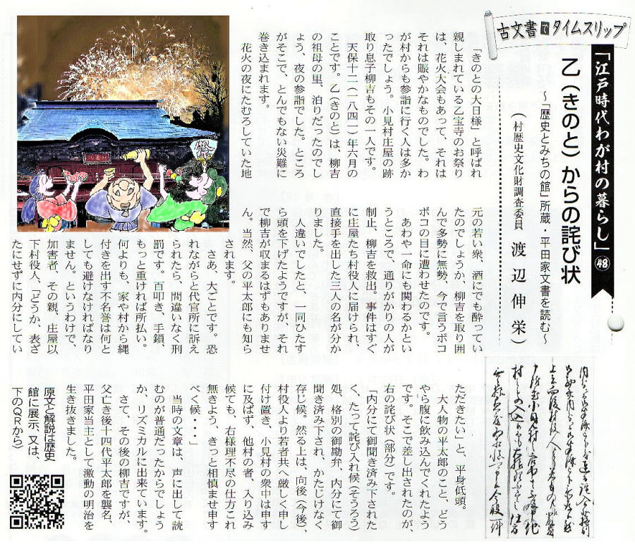| <解説> 乙(きのと)村(現・胎内市)の関係者から小見村平太郎宛の詫び証文。 平太郎は小見村の庄屋だが、この文書は私的関係ということなのだろう、肩書はない。 分かりやすい文章で、何があったのかは読めばすぐわかる。 天保12(1841)年6月23日は新暦でいえば8月9日だから、夏祭りの夜。地元の若者たち、花火大会で酒でも飲んで浮かれていたのか。 そこへ通りかかった平太郎の忰柳吉はとんだ災難に遭ってしまった。今で言えば警察沙汰になる事態。若者の親たちは大うろたえだったろう。庄屋以下の村役人も代官所から管理責任を問われかねない。何卒内分にと、必死のお願いがなされて、その結果としてのこの文書。 押印の6名中、3名は加害者、もう3名は村役人。村方三役といって、村行政のトップが「庄屋」、その補佐役が「組頭」、村の構成員である百姓(自作農=納税者)の代表が「百姓代」。江戸時代の文書にはよく出てくる。村長、助役(副村長)、議長(議会はないが)みたいな感じか。 平田家系図によれば、柳吉は、その後父の跡を継いで第14代平太郎を襲名。明治30年(1897年)まで存命しているので、この時のケガはその後にそれほど影響はなかったものと思われる。 同系図には、柳吉の祖父12代平太郎の後妻が乙村常田氏の娘、とある。つまり、柳吉の祖母に当たる方が乙村の出。その縁もあって乙宝寺の夏祭りの夜の参詣となったのだろう。平太郎が事を収めたのも、あるいはその縁があってのことかもしれない。 余談ながら、筆者(渡辺)の祖父は乙の隣村荒屋の出で、幼児、祖父の生家に泊まって乙宝寺の夏祭りに行った幽かな記憶がある。花火の記憶はないが夜店が沢山並んだ賑やかさは、祭りで買ってもらって舐めた笹飴の味と共に、70年以上たった今も浮かんでくる。 |
