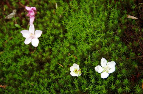 ![]() スギゴケに落ちた梅の花、桃の花 |