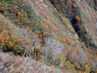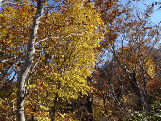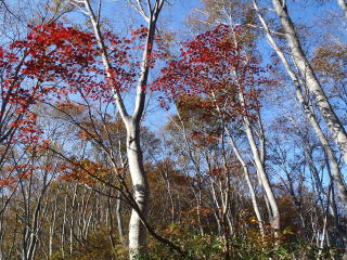 光兎山の大きな魅力の一つは、ブナ林。 登山道途中に「夫婦村」という表示がある。かつて夫婦で炭焼き小屋を営んでいた所とか。近年まで炭焼きで活用されたせいか、ブナは若い。 それだけに、鬱蒼としたブナ林ではなく、スラリとした若木が気持ちよく伸びている。風雪にもめげず、まっすぐに立っている、その率直さが、なんともいい。光兎山は、新緑のブナ林もいいし、この時期のブナ林もいい。いつ来てもいい。 |