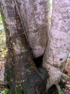 ブナの幹を伝う雨水とそれを貯める木の俣の窪み |