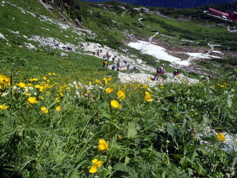 ![]() 八丁坂から見下ろすミヤマキンポウゲと千畳敷カール |