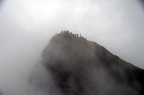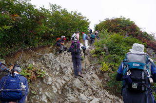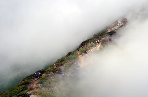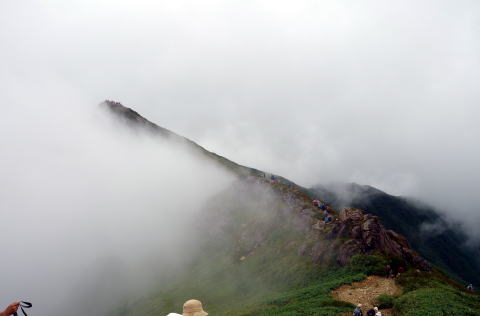 Haseさんは、谷川岳が初めての私に 山頂からの360度大展望をぜひ見せたい という 雲が少しあったほうが写真には良い と、絵描きのHonjunさん 晴れよし、雲よし、雨よし、山はなんでもよし と私 だから、いつも晴れない と、Haseさんが怒る コースのほぼ中間地点の 熊穴沢避難小屋に 9:35 ここまでの途に 花らしい花もなく淡々と登る が、しかし、 下山時には、ミヤマダイモンジソウや モウセンゴケをこの路で見かけるのだから 人間の目は、見ているようで見ていないものだ 避難小屋を過ぎると にわかに人が混みだして ときには渋滞することも 先に進むほど 人が混んでくる Haseさんは 集団を追抜いて先へ先へと進む とにかく速い 10:19 天狗の留まり場 ここまでで4分の3くらい ここからは、比較的なだらかな稜線の道 行く手のなだらから稜線上に 十字架のような標柱が見えて 疲れ果てた誰しもが、あそこが山頂かと 騙されてしまう 11:05 肩ノ小屋 ここでもトイレの行列 休む間もなく、先へ進む Haseさん、どうやら槍ヶ岳で 岳女となったKimiちゃん隊長にしごかれて 登山スタイルが変わったらしい 以東岳でもそうだったが ピークハンターに豹変したようだ ノンアルコールビア3本をHaseさんが背負っていってくれたのだが、 山頂に腰を下ろして、3人ともそれをすっかり忘れて、温かいコーヒーを飲もうとしていた それくらい、山は秋だった 汗が滴り落ちたついこの間までの夏山が懐かしかった それにしても、何十年も前のことだが、確か遭難というようなタイトルの映画があって、谷川岳は魔の山というイメージが刷り込まれていた だから、滅多に近寄れない山だと思い込んでいたが、行ってみて老若男女の人気の山だと驚いた いつか晴天の日に再挑戦して、Haseさん推奨の360度大パノラマを楽しんでみたい もちろん、Honjunさんが言うように、雲上の散歩道も悪くはなかった 何よりも敬老の日のプレゼント一眼レフにとって、雲の景色は格好の練習台になったように思う ガスが濃く、一ノ倉沢はのぞけなかったし パラッと雨も来て、 下山路に予定していた西黒尾根は諦め、 来た道を引き返した |