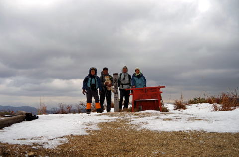 ![]() 光兎山々頂で4人と1匹記念撮影 気温は氷点下 |