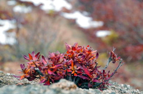 ![]() 新雪をバックに、コメツツジの紅葉 |