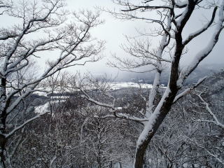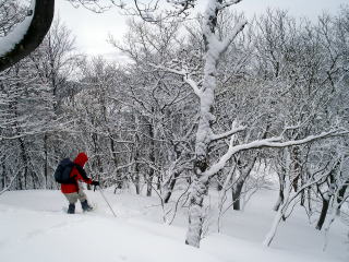 | あと標高差で200M上がれば頂上だが、今回は、初体験の小手調べ。寒さが身にしみてきたので無理はしないでこのくらいにして下ることにした。 下山路は、登りの足跡を避けて、わざと新雪を踏んで降りた。 動けば、すぐに体は温かくなる。 |