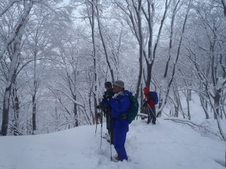 | 山頂についた。 まだ踏み荒らされていない山頂の雪原 そのむこうに、雪の花を咲かせたブナの木 そして、下界に湧きあがる雲 かすかに見える日本海 どうだ、この景色。 雨をものともせず、カンジキはいて山に登る気持ちが分かるか。 |
