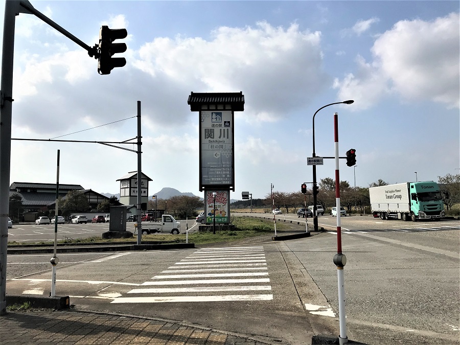国道113号「道の駅関川(桂の関)」と重文・渡辺邸の間に立っています。
