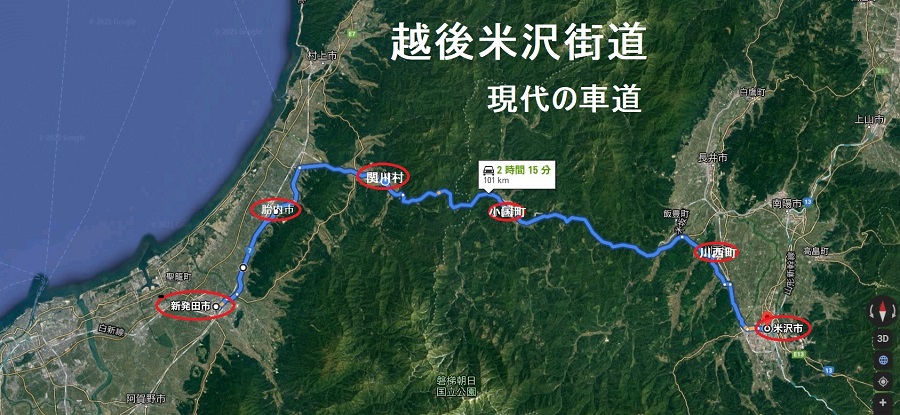 新発田起点、黒川、大島、下関、上関、大内渕、玉川、小国、米沢へ