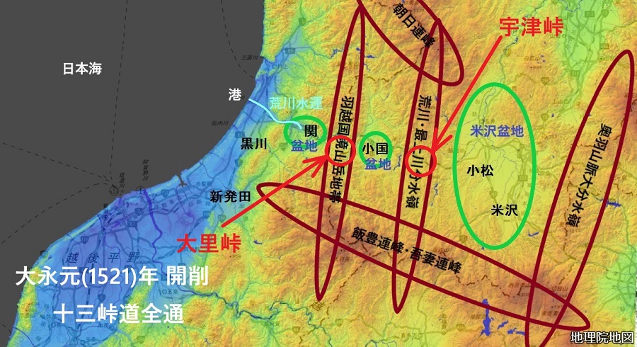 米沢盆地、小国盆地、関川盆地、越後平野の位置関係