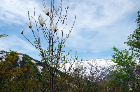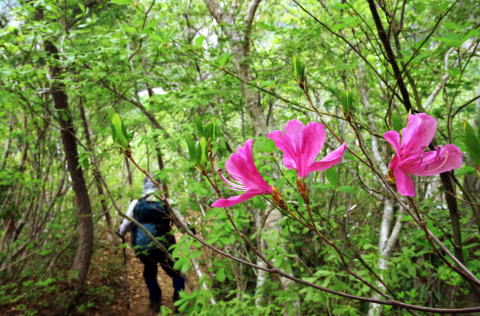 ムラサキヤシオにユキグニミツバツツジ、タムシバが、今が見ごろ。雪消の遅かった斜面にはチョウジザクラ、それに、カタクリやイワウチワがまだ見られるのもありがたい。今朝のTV山番では、関東ではイワウチワは幻の花とか。