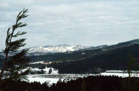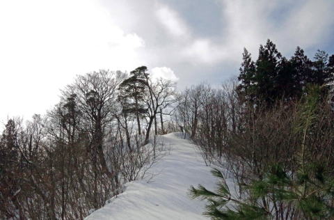 ![]() 峰の途中に送電線の鉄塔があって藪が刈り払われている、雪原 |