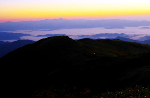 5:10 エブリ山頂から、雲海の彼方に黎明の朝日連峰を望む