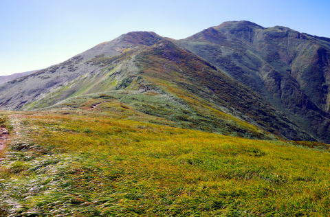 1700mを越えると、草紅葉が始っていた。エブリの辺りとは山肌の色合いが違う。地神北峰の斜面は少々色づいて、紅葉のはしりが見られた。