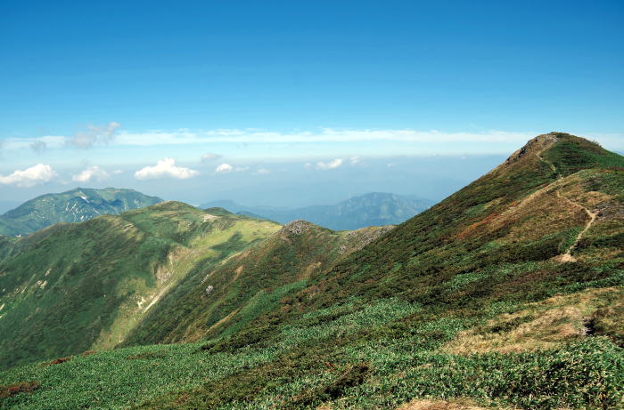 ここは、イイデリンドウの群れ咲くところ。まだ残っていないかとあちこち草叢の中を探し回ったが、見当たらない。頼母木山を越えたところで、後ろから人が来る。随分な軽装、道を譲ったら、「日帰りです」などと笑いながら、稜線上を走って行く。トレイルランというのだろうか、凄いもんだ、脱帽。
