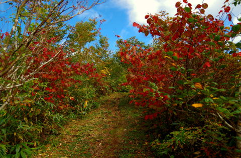 多少のアップダウンはあるものの、ほぼ平坦な稜線道で、ところどころに湿地や池塘があり、五段山、牛ヶ岩山、御前山、地蔵山のどれも、標示がなければ山頂であることさえ見逃してしまうほど。そんな山道で、はじまったばかりの紅葉の秋を満喫してきた。