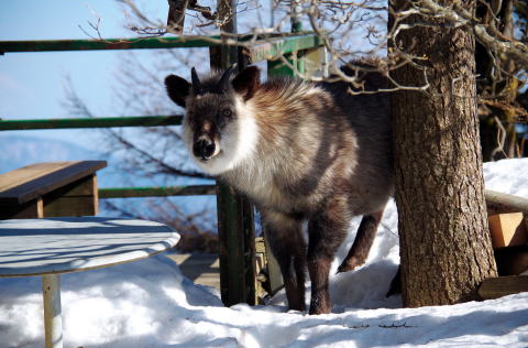 山小屋に着いたら、「カモくん」が歓迎に現れた 夜、小屋のガラス窓には「テン」の影も映った |