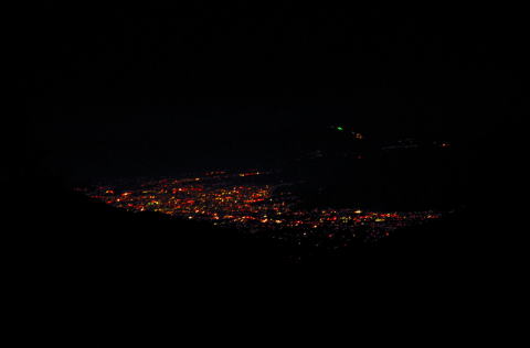 3月3日未明 山小屋の窓から 宝石をちりばめたような灯り 甲府盆地の方向、笛吹市か甲府市のあたりだろうか |