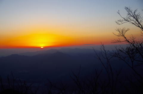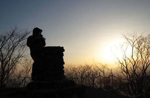6:10 山頂でご来光を拝む 右側に島のように見えるのは房総半島か ありったけの衣類を重ね着し完全武装で、6時前から山頂で日の出を待った その甲斐あって、絶景にであえた |