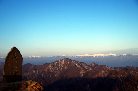 白く連なる峰は、三千メートルを超える南アルプスの山々 三ツ峠山頂の碑が、朝日を受けて |