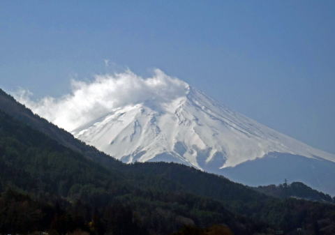 3月2日昼前、中央道を走る車窓から 山の陰から突然現れた富士には、強烈な北西の季節風が吹きつけていて、これも絶景 |