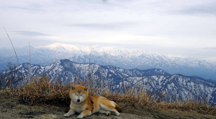 今回も同行したタマ公、なんと、気持ちよくなって山頂で居眠りをこき始めた。海抜966mの天上で悠然と昼寝、それも、雄大な飯豊連峰をバックに。