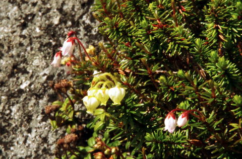 ![]() ツガザクラとアオノツガザクラの雑種で、コツガザクラというのがあると白山・花ガイドにあった。よく見るとガクに色が入っていて、もしかするとこれがそうかもしれない。 |