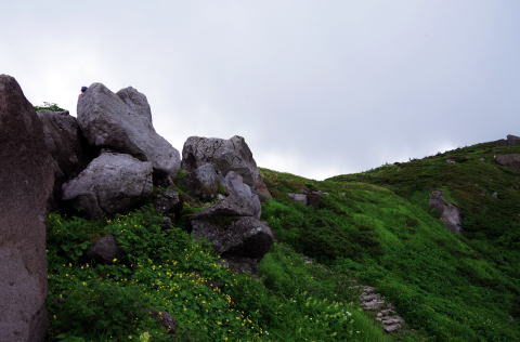 ![]() 11:57 観光新道を選択したのは正解だった。尾根筋には、ニッコウキスゲ初め様々な花々が、咲くなら今とばかりに咲き競っていて、カメラ三昧、花三昧の山歩きとなった。 |