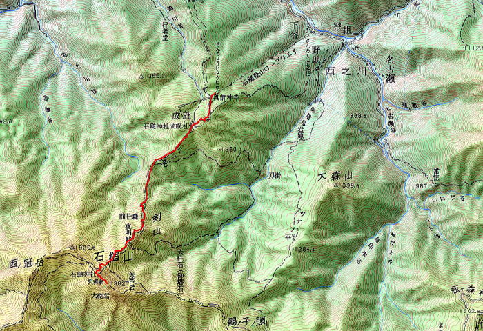 ![]() 14:02 八丁坂途中で、 もう一度木の間から見える石鎚山を振返った |