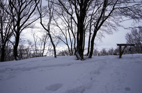 ![]() 山頂の雪中美林 この樹間にテント設営 |