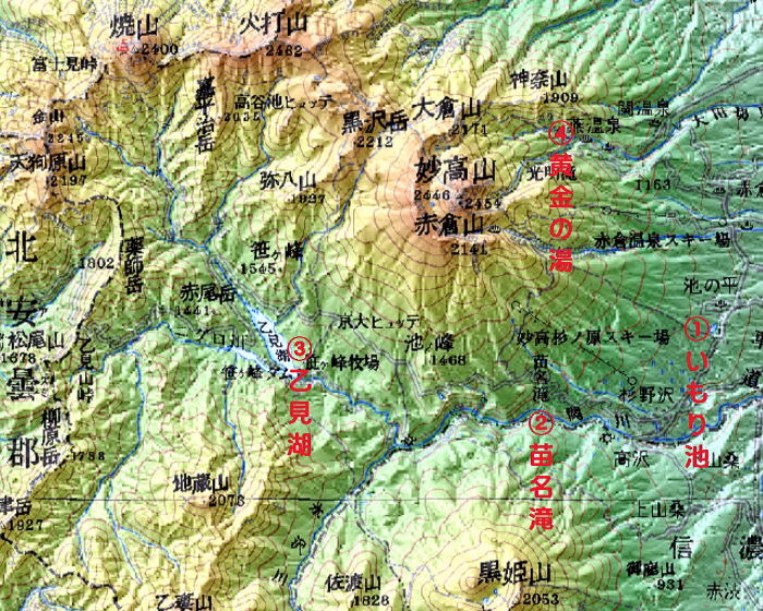 ![]() <彷徨いた所>8:15いもり池-9:50苗名滝-11:45笹ヶ峰・乙見湖-15:00燕温泉・黄金の湯 |