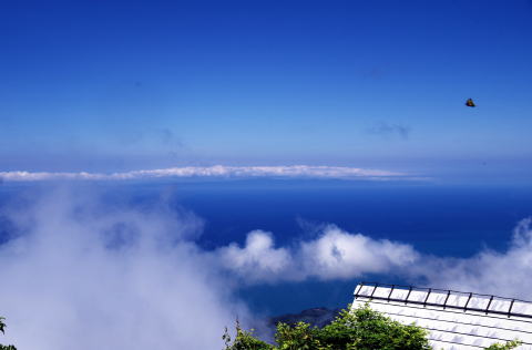 ![]() 山頂にキアゲハ舞い、海上の雲の下に佐渡の島影 |