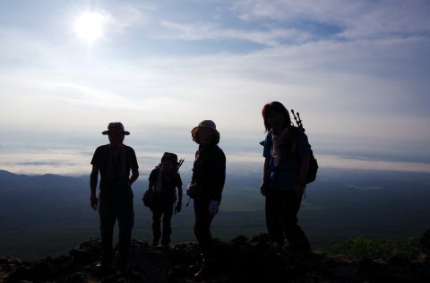 ![]() 5:48 第2噴出口跡で、雲海を眺める一行 頭上に朝陽を受けて聳える岩手山々頂 |