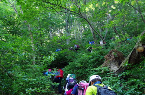 ![]() 11:07 ヤセ尾根を越えて山頂へ最後の登り、総勢37名の登山隊 |