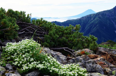 ![]() 8:14 タカネツメクサの群れ、北岳稜線の向うに富士 |