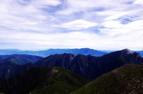 ![]() 8:33 仙丈山頂から 中央アルプス 宝剣・木曽駒の右に噴煙の御嶽、その奥に白山 |