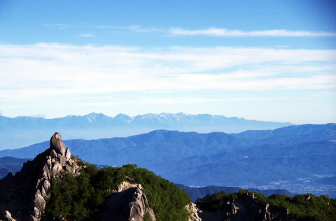 ![]() 6:23 甲斐駒の先には穂高連峰、槍ヶ岳もくっきり |