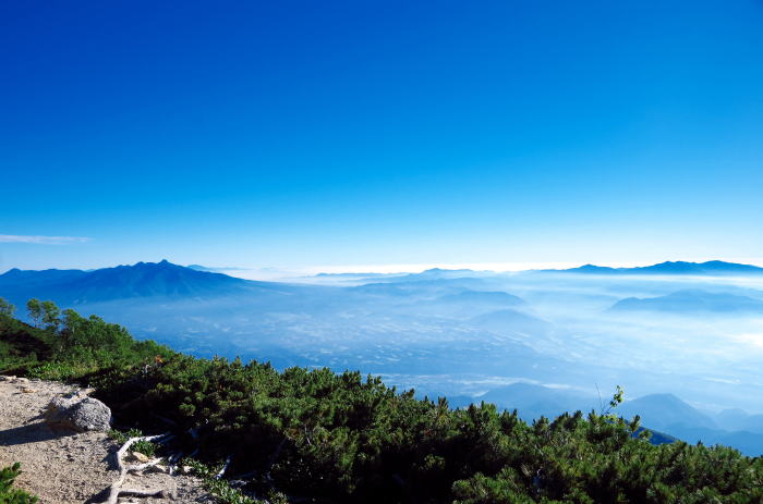 Unqさんのブログ「鳳凰三山」を、 →こちらから ご覧ください。 YouTubeのスライドショーは, → こちらから どうぞ。 この日も、2時半に起床。 食欲はやはりない。高カロリーの行動食を間断なく食べているので、そう心配はしていないが、朝食は無理して食べることにした。 例の山用アルファ米、こいつが食欲を失わせる元凶なのだが、今朝は熱湯を多く入れて粥状にし、さらに梅干味を練り込んで、何とか半分強は腹に詰めた。 テントを撤収して4時半前には出立。すぐに梯子場あり、シラビソ林の山腹を急登する。 1時間10分で地蔵岳からの縦走稜線道に合流。標高差300m、ほぼコースタイムだ。 昨日はバテ気味で悲観したのが、一晩熟睡すれば元気は回復だ。 が、それだけではない。実は、今朝の荷詰めでYoumyさん、共同荷の私の持ち分を黙って自分のザックに詰め込んでくれていたのだ。そういった配慮のお蔭も多分にあった。 それにしても、Youmyさんの体力たるやただ者ではない。 下山した後のことだが、刈安の町へ下りて格安の市営浴場に入った。そこの入口は2階にあって、普通の家屋の2倍はあろうかというその階段を、私はおろか、さすがのUnqさんですら、やっとやっとで足を運び上げたのに、なんとYoumyさんはといえば、トントントントンと軽やかに駆け上がったものだ。どうも、身体の作りが違うのではと、Unqさんと思わず顔を見合わせてしまった。 そういうUnqさんにしたって、人一倍の大荷物を背負ってくれていたのだから、長い下りの負担は相当のものだったはずだ。 そういった、二人の温かい配慮のお蔭で何とか3日連続の山行を完遂できたというわけなのだが、それで話は終ってしまうので、元に戻すと。 鳳凰三山を結ぶ主稜線に出てしまえば、そこは昨日以上の絶景の連続だった。 まず、雲海がよかった。 八ヶ岳の裾野の上は薄雲で、レースを透かしたように下界が見える。 昔、佐渡のとびっきり澄んだ海で泳いだことがある。ずっと下の深い海底の岩や藻や貝が小さく見えて、空に浮いたら、下界はこんなふうに見えるのかと思ったものだ。 あのときの感じを思い出した。 空に浮いて、薄雲の下の下界を見ているような気分。 もしかしたら、人間は空を飛べないがために、高い山や塔に登って、その気分を味わいたいと思うのだろうか。それは、人間の本源的で潜在的な欲望なのかもしれない。 な~んて、哲学的なことをチラリと考えた。 数日後のことになるが、ある会合で、なぜリタイア後に山に登る人が多いのかと迫ってくる人がいて、ここぞとばかりに、鳳凰山で得た哲学を披露したら、そりゃぁ屁理屈だろーと一蹴されてしまった。 やっぱり、そこに山があるからサ、でやめておけばよかった。 それはさておき、雲海は、八ヶ岳から南に離れるほど濃くなって、富士山は、その濃い雲海に見事に浮かんでいたし、三ツ峠山、雲取が遥か微かに雲海から頭を出していた。瑞牆・金峰・甲武信の山塊は、海に浮かぶ船のようにも見えた。 それに、行く手右には、常に北岳が、間ノ岳と農鳥を従え、でーんと大きく構えて、鳳凰三山を見守っているよう。 後ろには、あの威容の甲斐駒。なぜ来なかったかと、叱られているような気もしてくる。 富士の右隣で、雲から顔を出しているのは櫛形山だろうとUnqさんが言う。花の百名山だとも。 帰宅して地図を見ると、その先に薄く見えていたのが日蓮の身延山ということになるだろうか。RWで登ったあの山頂から、北岳が正面に見えたものだ。 そういえば三ツ峠の山頂で、凍えながら日の出と富士を見たのも懐かしい。 と、そんな具合で、これまで登った山、今後多分登るだろう山、いつ登るかは分からない山、どれもまったくワクワクさせる山たちがずらりと並んでいた。 富士にまだ登っていないのも、気がかりといえば気がかりだ。 今回のように、白馬・雪倉・朝日のつもりが、思いもよらずこうやって鳳凰三山に来ているのだから、あの山々にだって、いつか必ず行くことになるだろう。 昨日は無理だと思った300mも、一歩一歩歩いていれば、必ず登り着くことができる。 山も一つ一つ登っていれば、いつかは未知の山にも登る日がやって来る。 千里の道も、一歩から。一つ一つ、確実にだ。 夜叉神峠まで下ってきた頃、高い峰には雲がかかり始めていた。 週間予報も、晴天は今日まで。 4日間、ずっと好天に恵まれた。 本当にありがたかった。 この4日間も、食って出して只管歩いて感動して眠る、単純行動の繰り返しだった。 山の行動原理は単純だ。だから、いい。 リタイア組に登山人が多いのは、現役時代、人間社会の複雑さに辟易としたせいかもしれない。 一蹴した彼の仁は、まだまだうんざりするほどは人間社会の複雑さに触れてはいないのだろう。 それを言っておくべきだったか。 単純系の疲労は心地よさを伴うが、複雑系の疲労は困憊に至るのだ。 さて最後に、 沢山お世話になった同行のUnqさんYoumyさんはもちろんのこと、突